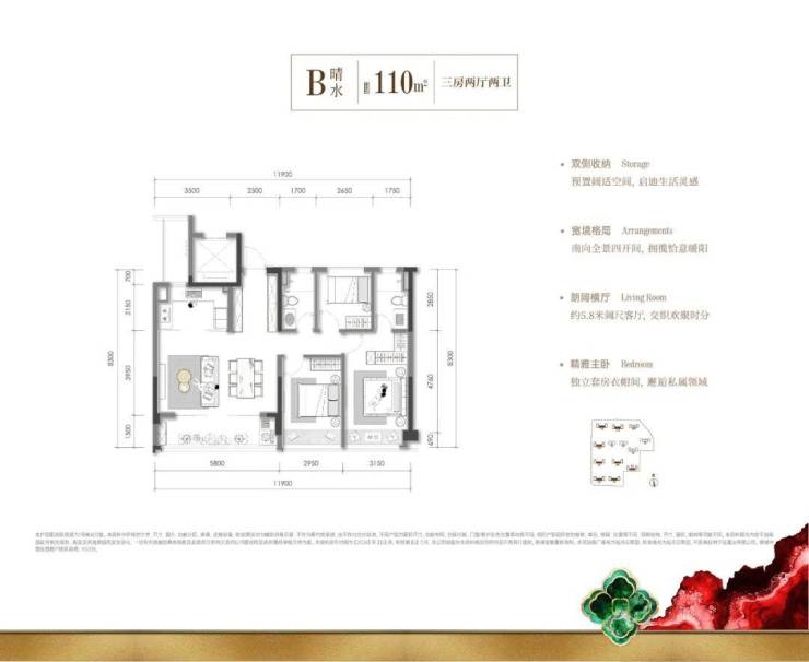 建面约110㎡惬意三房则重塑了市面上同等户型南向尺度的可能,带来四开间朝南的进阶体验,约5.8米阔尺餐客厅,从容包揽全家人的生活意趣,更有双侧收纳,兼具生活美学与实用主义。