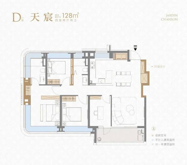 128㎡四房两厅两卫:四开间朝南,横厅设计,空间开阔,满足三代同堂