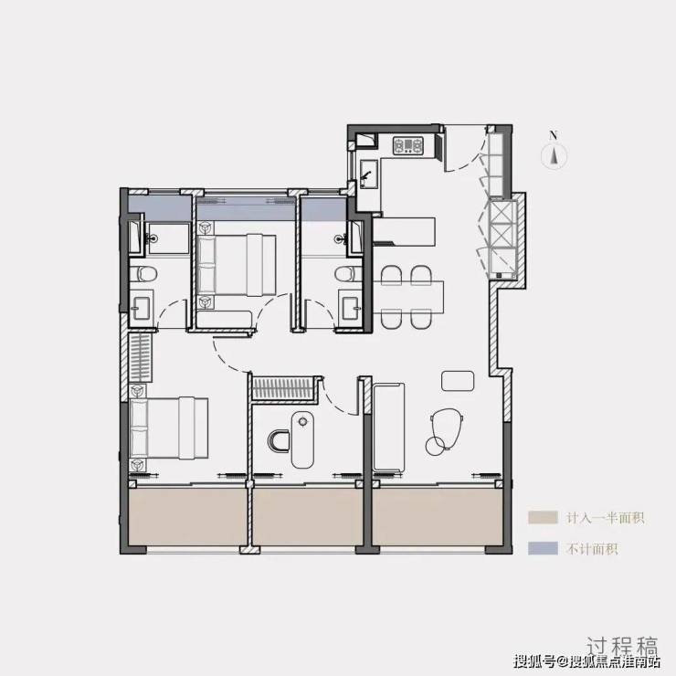以约 108㎡户型为例,其 “逆天三朝南阳台” 设计,不仅让实得率拉满,更实现了 “无敌采光视野”—— 三开间朝南搭配多阳台,让阳光充分涌入室内,每一个空间都能享受到通透明亮的居住体验,将 “理想生活” 落到每一处细节里。