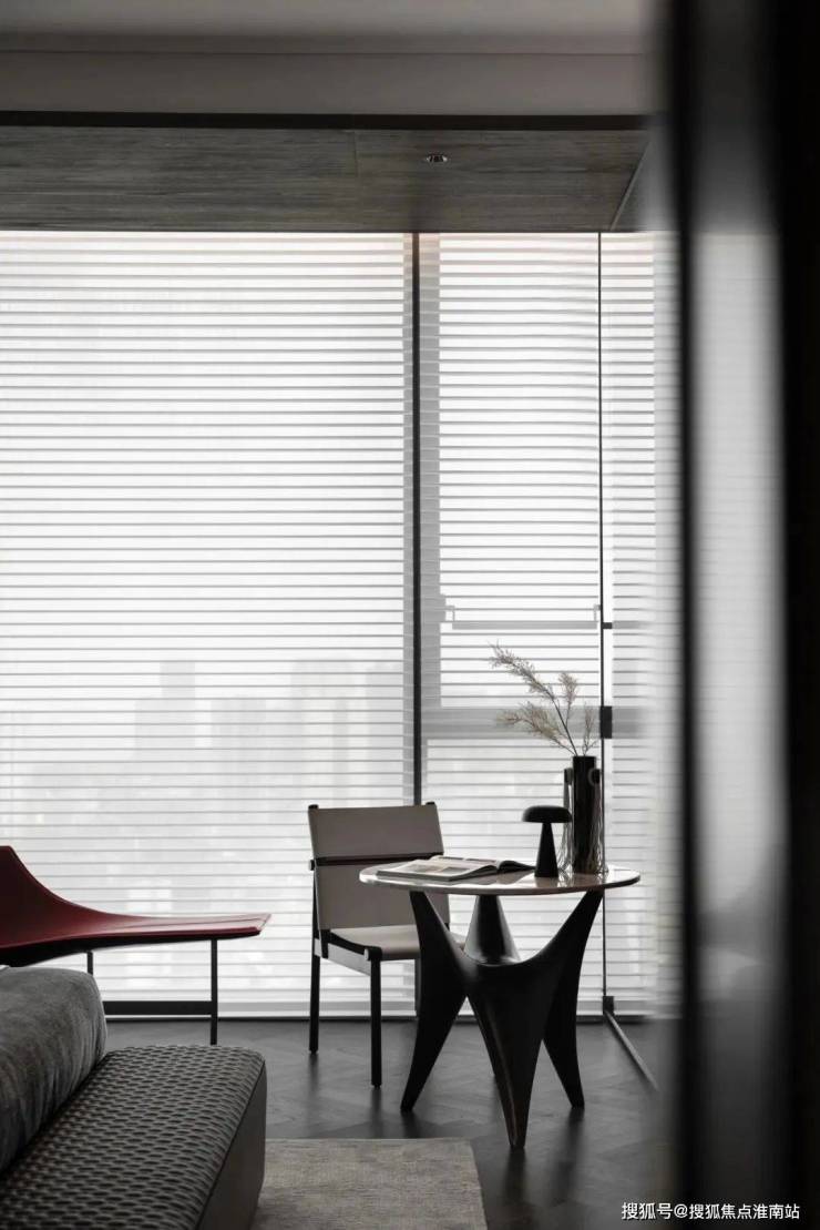次卧的百叶窗带来有序的光影节奏,为低调奢华的家增添一份自然的韵脚。宜人的单椅,胡桃木的沉稳搭配咖色格子地毯,坐卧随心,岁月静美。
