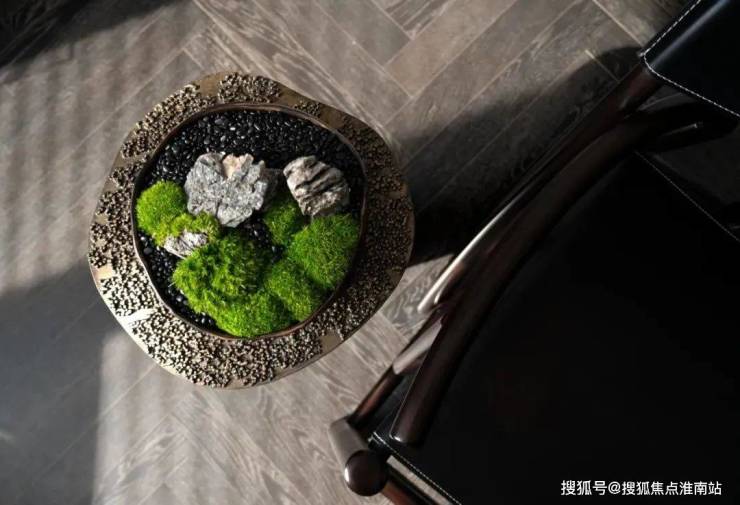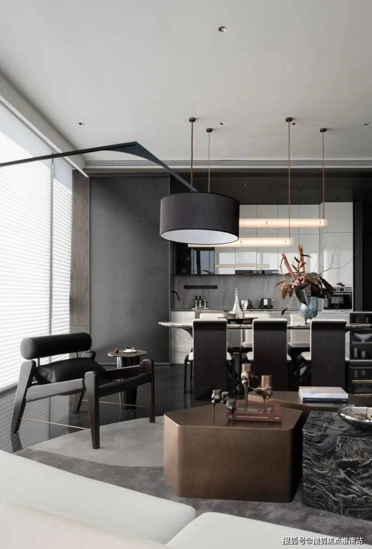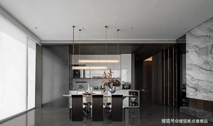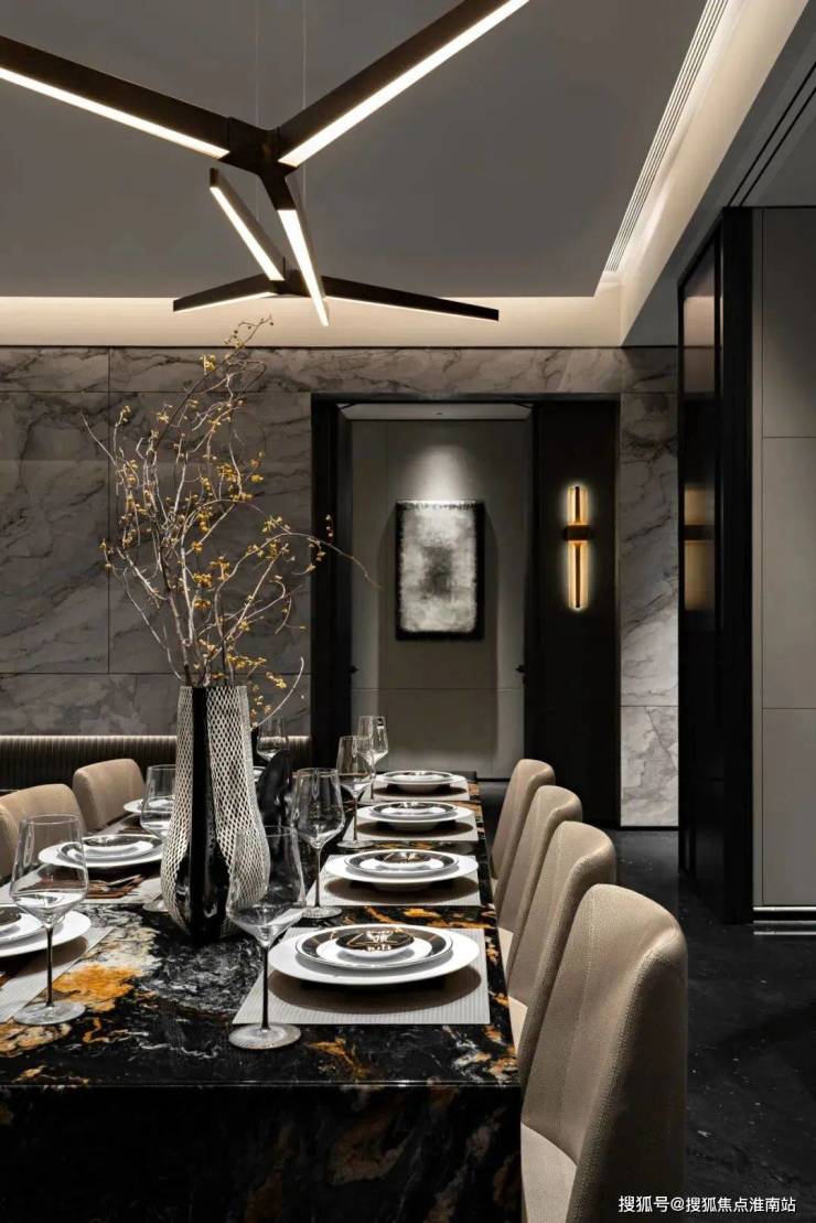 餐桌选用黑金岩板展示出沉稳与奢华,自然的纹理中藏着韵律美,金属、石材、玻璃的碰撞组合,奢华不浮华,在绿植的陪衬下,以内敛舒适抚慰人心。