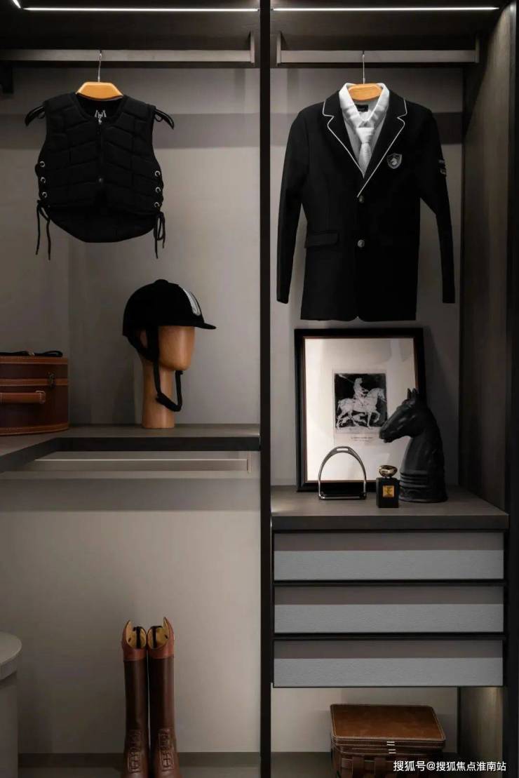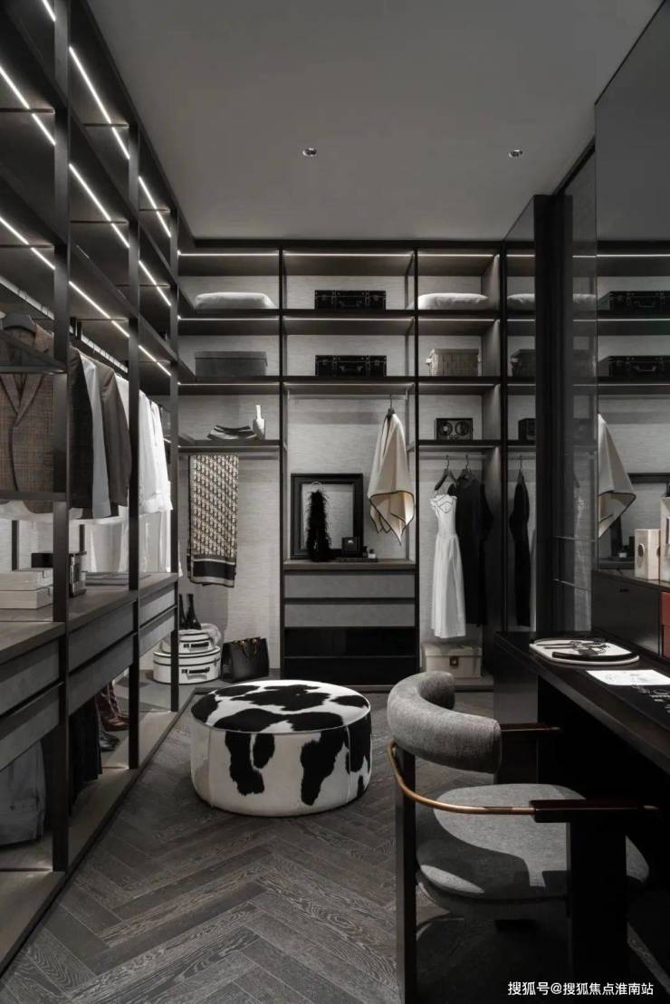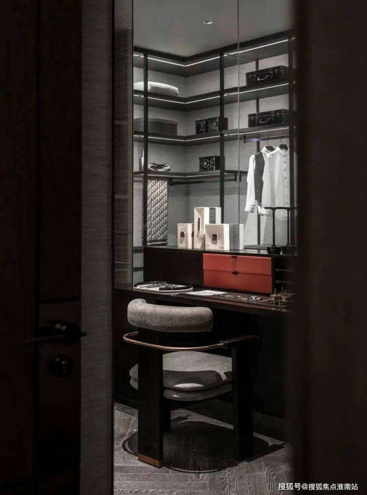 深色调的衣帽间营造一种冷静理智的质感,以简洁的线条形体划分空间,彰显了当代都市人群先锋时尚的生活态度和不俗品味,在优雅的形体中,彰显对生活的自在掌控。