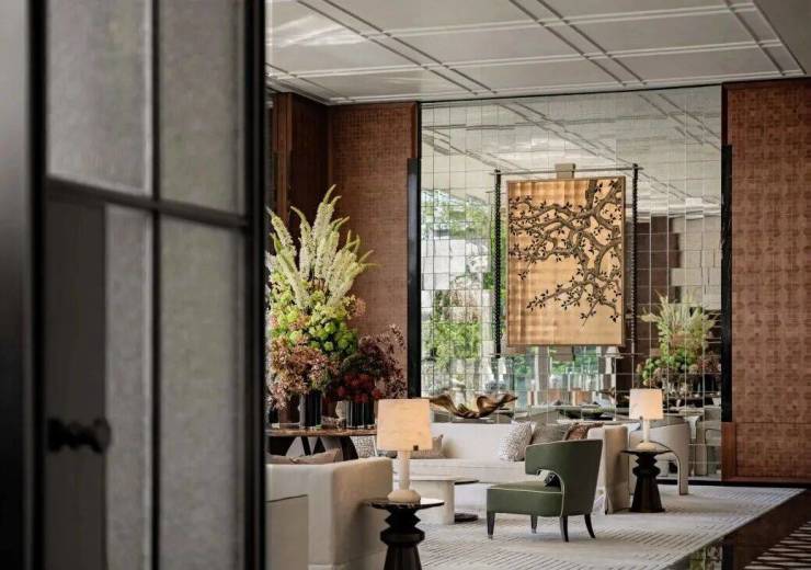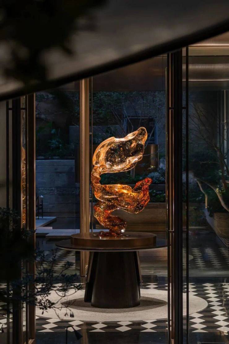 在生活馆里,你能看到发光石材的背景墙,瑰丽酒店同款壁灯、昂贵的黄虎眼奢石制作的接待台、同源瑰丽的风泥客石屏风、手工敲荔枝面……如此多华贵材质的运用,不经意一瞥都会被惊艳到。