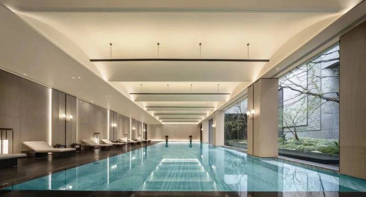 更让人惊喜的是,项目生活馆打破传统平面布局,创新性地将会所与泛会所融为一体,大面积玻璃幕墙消融室内外的界限,把茶室、健身房、瑜伽室、恒温泳池、私宴厅、棋牌室等空间都面向庭院景观,这样的配置,放眼全杭州都难得一见。