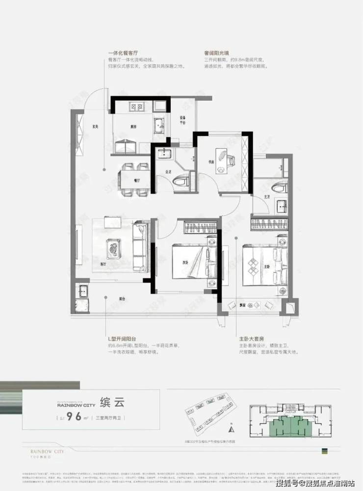 像建面约96㎡户型,整体三开间朝南设计,约9.8m奢阔尺度,户型方正大气,明亮通透,动静分区,再加上约6.6米开阔L型阳台,轻松实现一半洗衣晾晒、一般诗意生活的美妙画境。