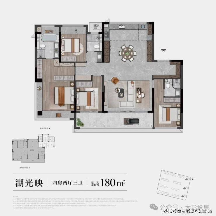 主卧270°飘窗设计,湖景采光、视野极佳,南向内卫设计,新颖实用;