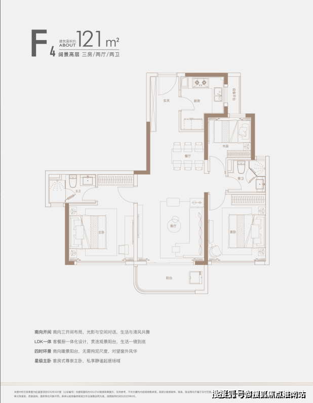建面约140㎡四房:三开间朝南户型,南北通透,采光条件优质,客厅明亮宽敞,彰显大气布局。