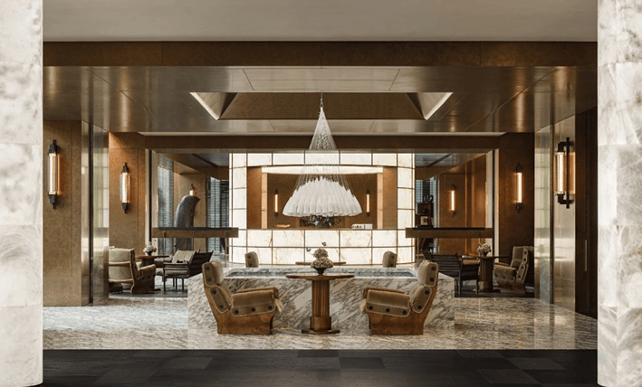 项目采用地上+地下三层同标准精装入户大堂,一楼大堂层高约6.6米,大堂选用有着媲美艺术品表现力的亚马逊绿天然奢石,结合仿古铜不锈钢、艺术壁灯为点缀,将上海的摩登气息注入归家大堂,给业主更强烈的入户仪式感。