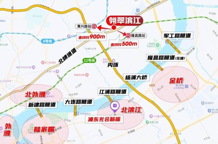 交通上,距12号线隆昌路站约600米、8号线黄兴路站约800米,双轨交环绕;南侧紧邻周家嘴路,可快速接驳内环高架。商业配套成熟,1公里内可达宝龙旭辉广场,3公里内覆盖合生汇等大型商圈。