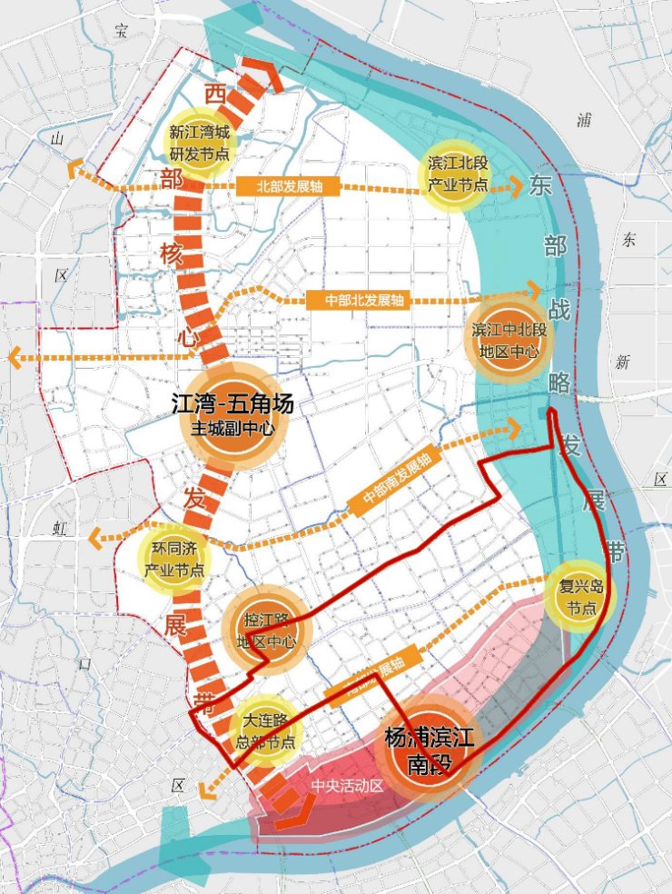 展望杨浦区2035规划,为加速实现“东西携手并进,南北互动发展”的战略目标,通过优化空间布局,促进功能区域的联动与融合,规划构建了一个以“一核引领,三心聚力,两带贯穿,四轴联动”为特色的总体空间架构。