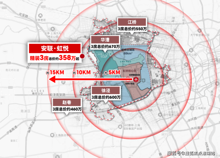 以虹桥火车站为圆点,10公里为半径,几乎所有板块新房价格都逼近甚至超过6万/㎡,4字头的华新甚至比二线辐射板块赵巷还要实惠!