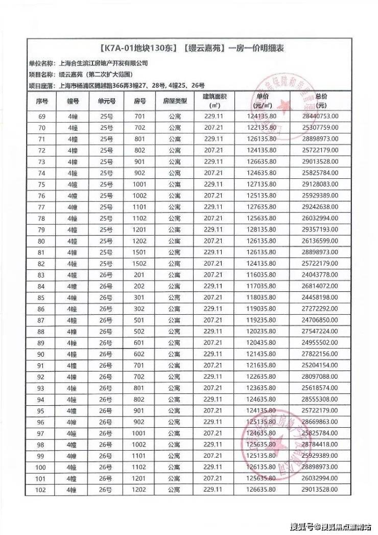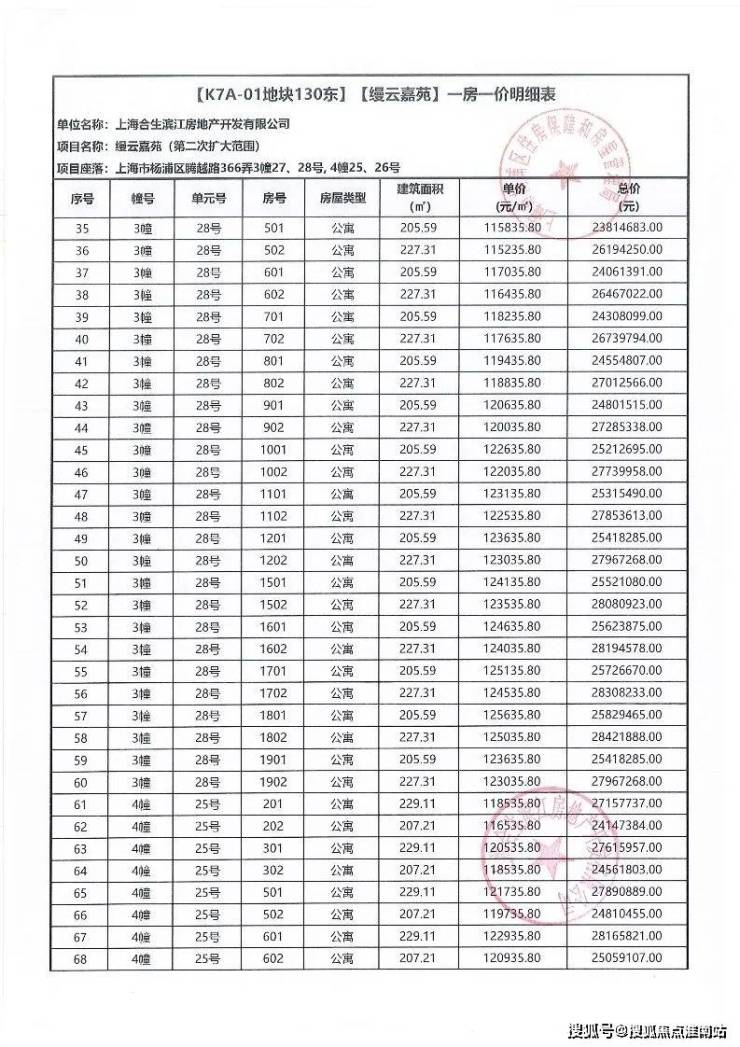 一房一价表如下
