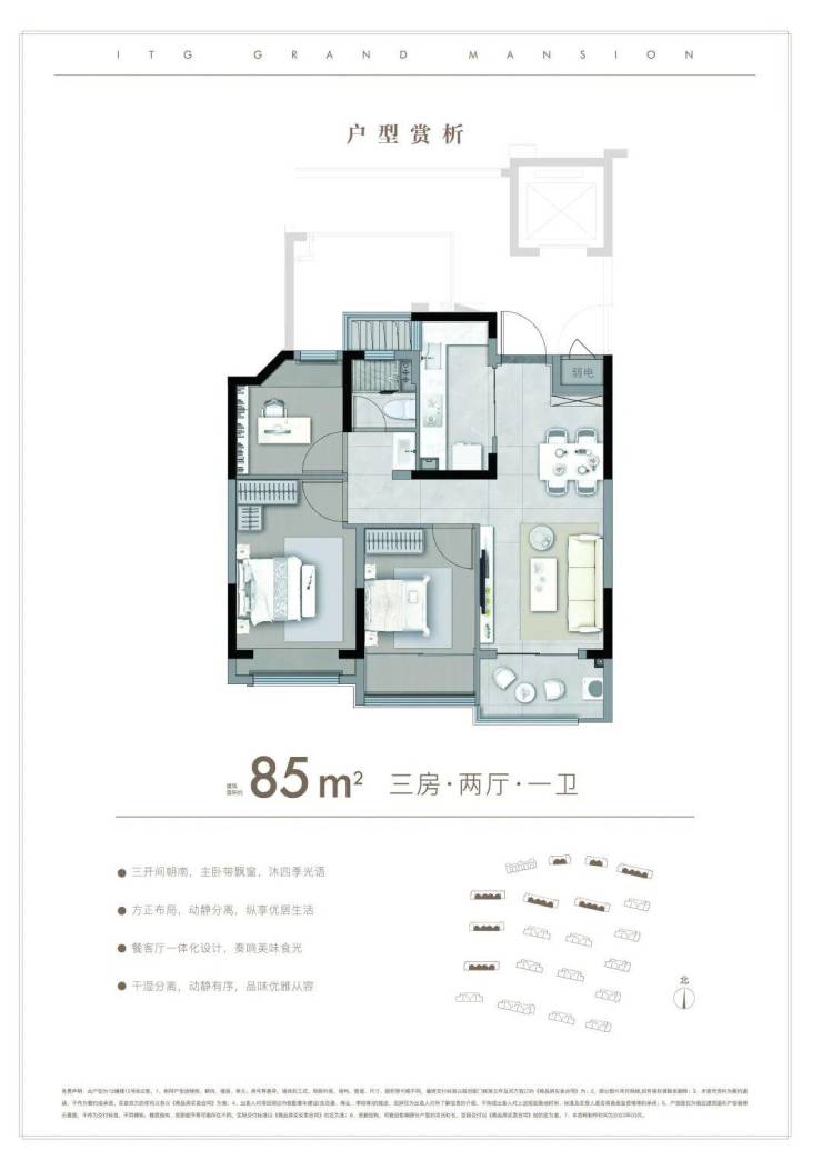 85㎡三房一卫:三开间朝南、全明通透、高得房率(约 78%-80%),339-368 万起