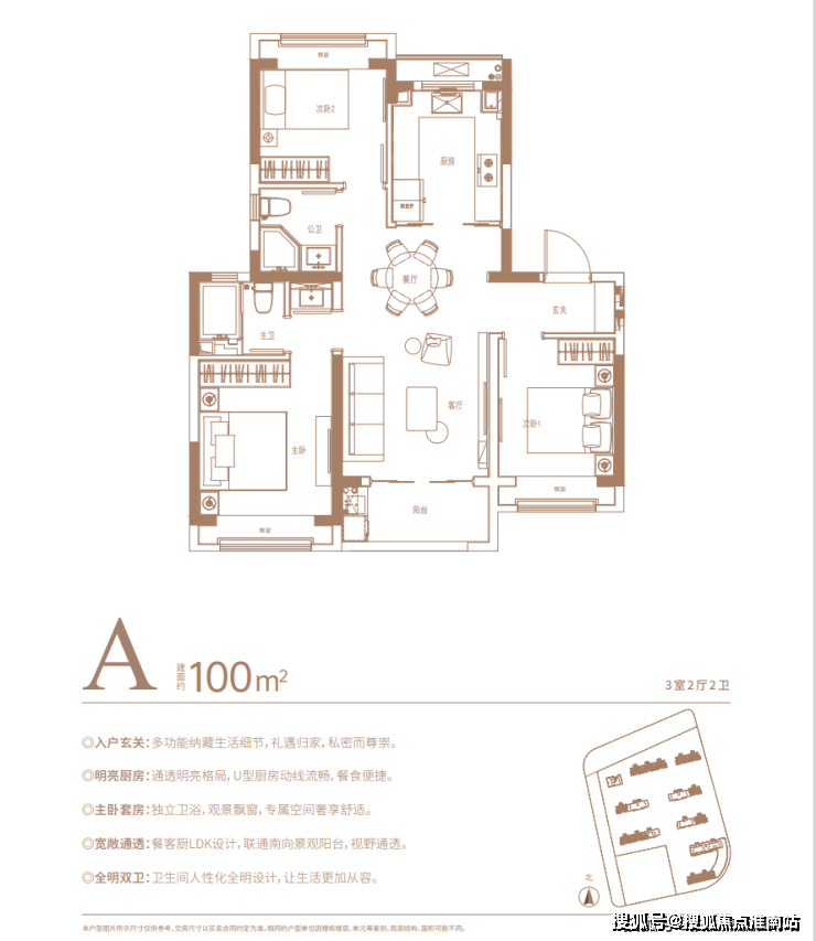 建面约100㎡3房相比于约90㎡段3房,各功能间舒适度更胜一筹,2卫设置也更符合大家庭居住需求。