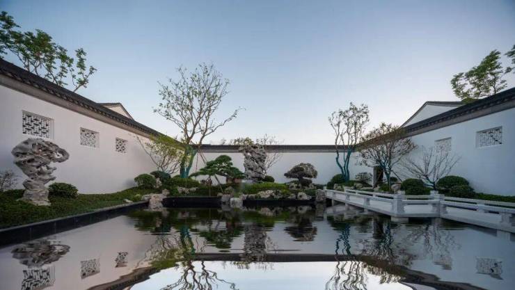 园内设置七处景观组团,以中国各大古典名园为借鉴,并融入宋代的雅致生活韵味。宋式园林更强调“精而造疏,简而意足”,擅以意山水画为蓝本、以画设景,诗词为主题。步履其中,移步换景,步步生趣。花园组团规模扩大,户户有景,各自成趣,或临廊听雨,或观亭赏风,居住更为诗意。
