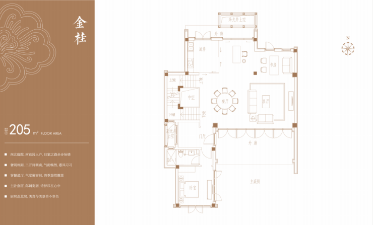 园内布局五进制南北主轴、以及“双龙戏水”格局的双水街,巷道联通,设七大景观组团,形成“一环、两轴、七境”布局。175席中式园宅,依巷分布南北,横平竖直,秩序井然。