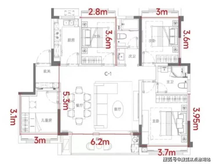 它不仅做到了 四房设计,更是做到了6.2米的宽厅,尺度媲美大平层,北向房间还能够放置1.5米的床。