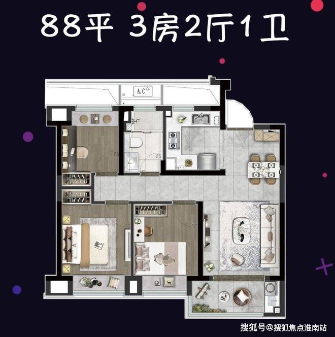 建面约88㎡的3房2厅1卫,位于楼栋的中间套,三开间朝+动静分离格局,通过全屋飘窗拓展实用面积,更适合小家庭客户升级居住环境。