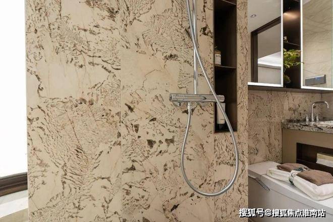 上海宝山淞南·招商序售楼处电话☎:400-881-8994(官方预约看房电话)比如:除了卧室的拼花地板外,墙面与地面绝大部分都是岩板与奢石!就连卫生间的墙面、餐客厅外连通的阳台都做到了岩板通铺。