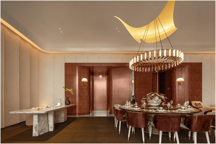 自然贯穿了整个社区公区的设计语言,整体约1200㎡立体会所+约1700㎡主题架空层,配备了私宴厅、瑜伽室、棋牌室等休闲空间。