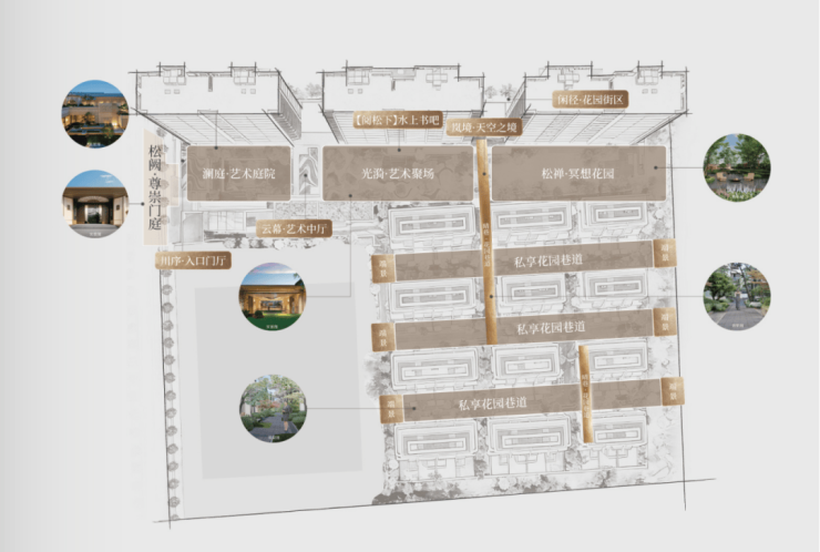“两轴三巷六园”是专属于联排别墅区的园林叙事,宅院合一,居游庭园,转译杭州山水风貌,传递在地文脉历史,9大景观节点、3条景观巷道、6处端景花园,户户推窗见景。巷道以松为主,搭配红枫、红梅,四季有景、曲径通幽,自然隔开楼栋,一步一景,归家如游园。