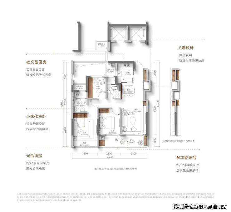 户型方正,没什么浪费面积,虽然是中间套设计,但做到了全明户型,通风效果好;南向三开间,双联阳台+飘窗,南向采光充足,阳光满堂;超配S墙,隐藏收纳柜,让小家越住越大,可以说杭州少见。