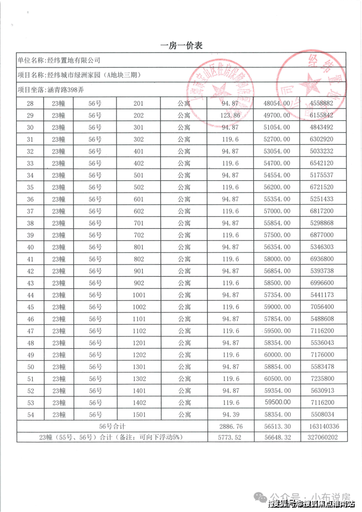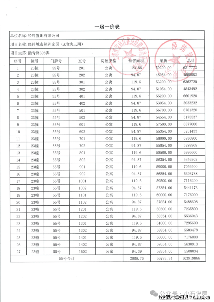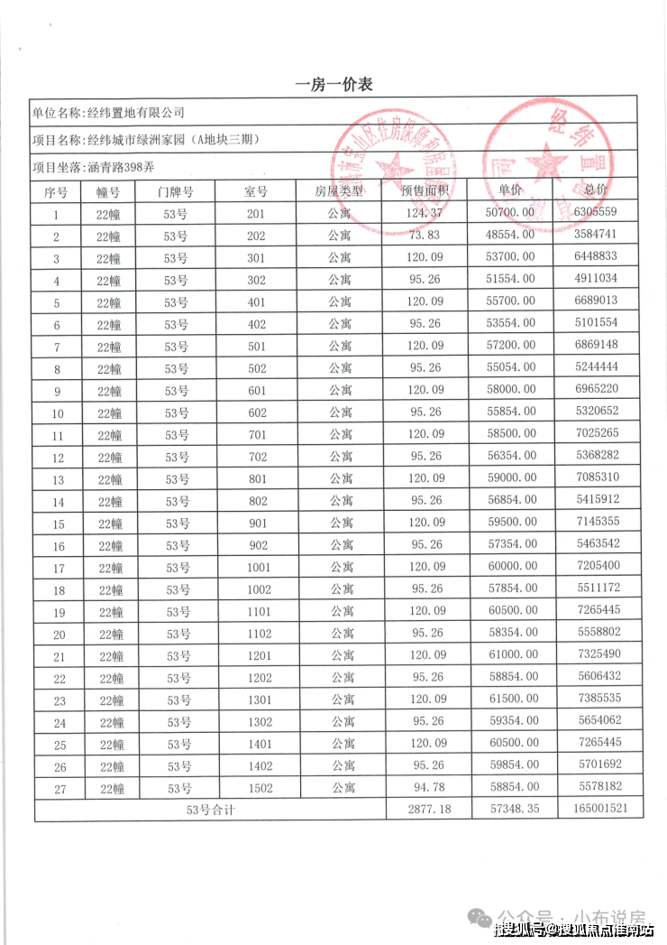 完整一房一价表如下: