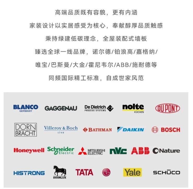 交付标准:精装交付,配置嘉格纳/帝泽厨电、唯宝卫浴、旭格门窗等国际一线品牌