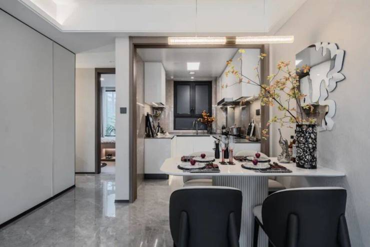 客餐厅的颜值超高,地砖、墙布都在交付标准里,整体风格更为统一,将好看+好用发挥到了极致!