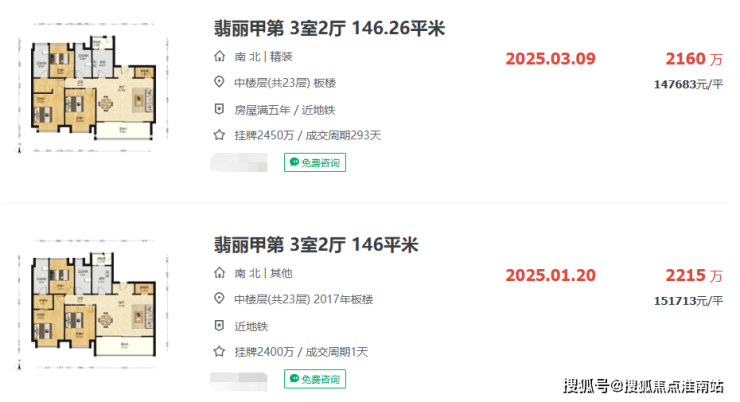 杨浦滨江的标杆项目翡丽甲第就在地块西侧400米的距离,目前该小区挂牌均价15.28万/㎡,近期2套成交单价在14-15万/㎡左右,价格还是相对坚挺的。