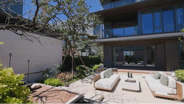 沿风雨连廊漫步,耳畔是流水淙淙,眼前是叠石苍松。约460㎡下沉庭院不像景观,更像一幅您就在其中的立体宋画,一草一木,都可触摸、可对话。