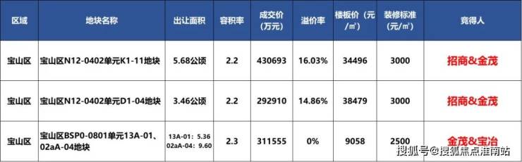 宝山杨行13A-01、02aA-04地块,由金茂&宝冶以底价竞得,成交总价31.15亿元。