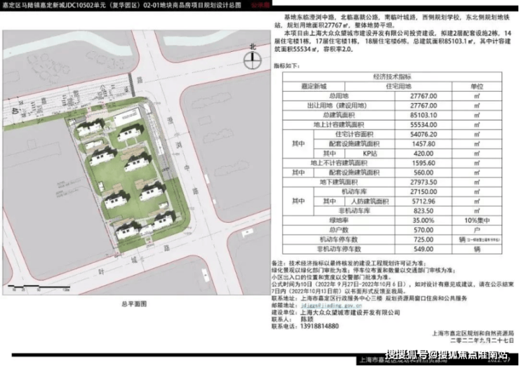 根据设计方案显示,项目拟建2层配套设施2栋,14层住宅楼1栋,17层住宅楼1栋,18层住宅楼6栋。总建筑总建面85103.1m²,其中计容建筑面积55534m²,容积率2.0;共570户。