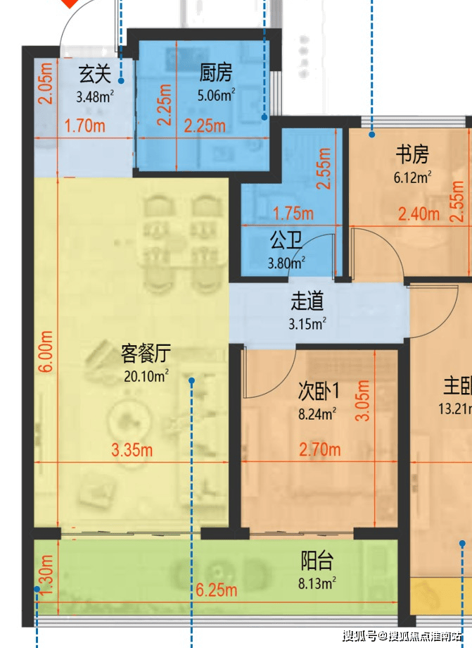 两个南次卧都各自带有飘窗,包括公区外挂的南向长阳台,这既是为业主省钱的政策红利面积,也让房间采光面更好。