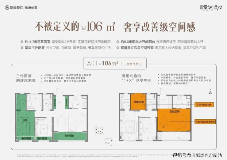 首先,这套建面约106㎡户型,首推创变空间,整个户型南向面宽达到了惊人的约11.7米。