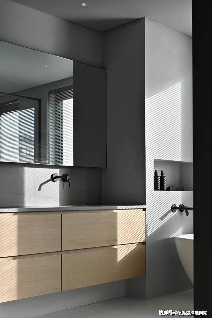 光线在百叶窗的过滤后,格外温柔,悄然点亮室内空间。夜幕降临时,此处又变幻成了一个隐私的场所。