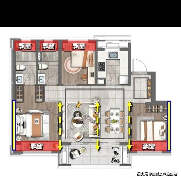 整体设计方正,南北通透,拥有约11.2米超阔南向面宽。餐客阳台一体设计,大大提升了空间的视野,看起来明亮宽敞,亲友家人聚会不会显得太局促,同时功能分区明确,也成就了难得的建面约89㎡四开间朝南。全户型5个飘窗,让生活更惬意;充足的收纳设计,日常起居变得井然有序。双卫干湿分离,也为平常盥洗创造了更舒适的使用空间。