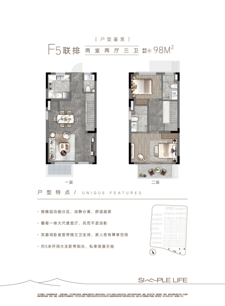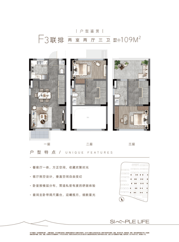 项目合计47幢楼,其中洋房12幢554套,联排33幢301套,项目整体分两批次推出,总计855套。采用人车分流,即保证社区整体设计的美观,又保证业主的安全性,车位有920个,做到1:1的比例。