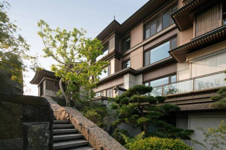 从空中鸟瞰整个地块,一字横向排开的建筑群落充分与不远处的城市湖山形成呼应关系,主入口被布置在次级道路上以保证官邸大宅的私密与宁静,沿亚太路一侧则对城市喧嚣主干道形成退让,行车落客处低调中透着一股世家屋檐的显赫气派。搜建筑
