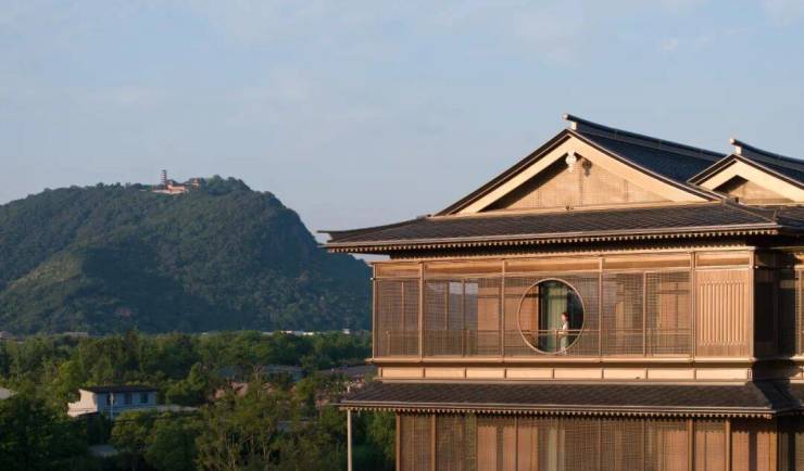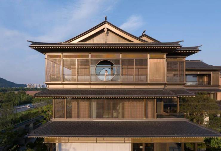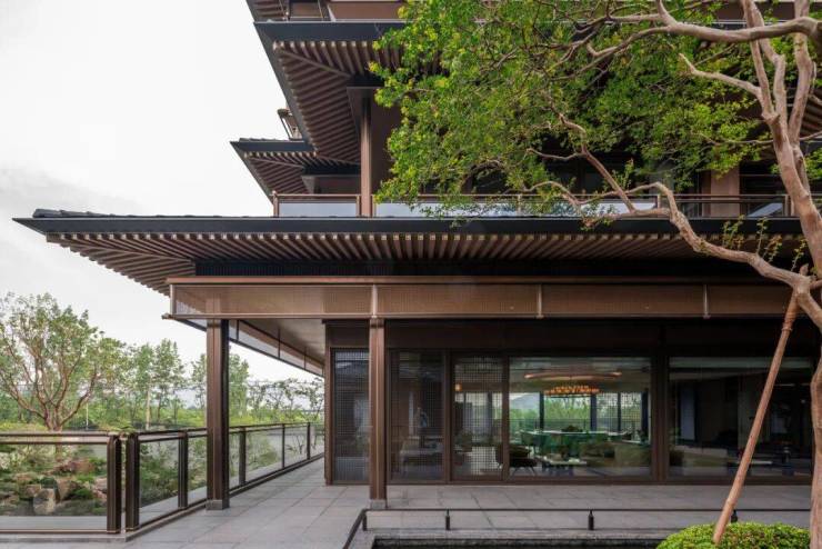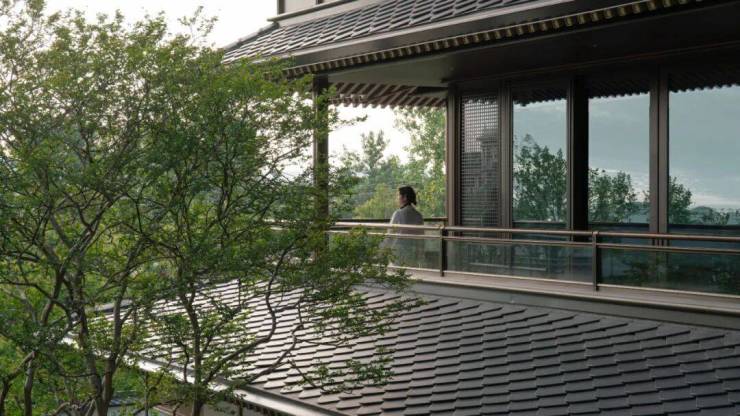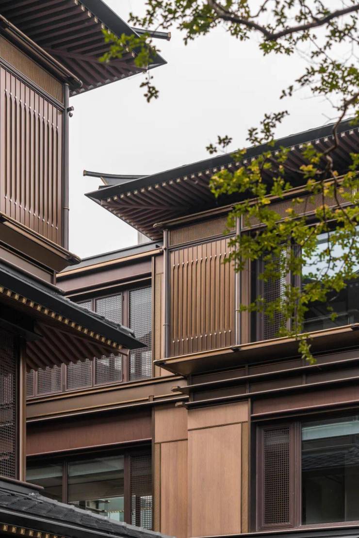 屋面曲线延续了宋代举折构造形式,整体更为轻薄现代。整个建筑立面也不再是厚重的墙体结构,大块面通透落地玻璃窗被木色金属格栅包裹,有韵律地竖向划分成屏风式条块,这使得建筑形体的表达更为简洁,整体呈现一种更为简约的轻盈感。