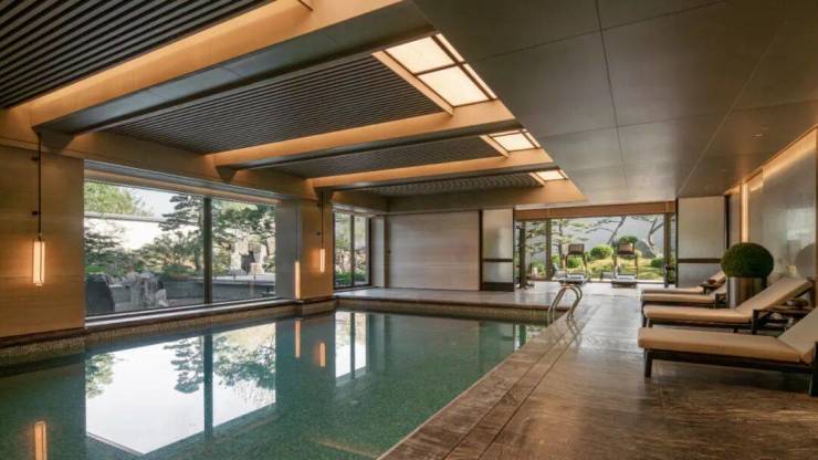 从室内泳池朝外看去,园内水体聚中有分,动态的水和静态的山石带来独特的观感,一幅幅自然画作成为大面幅落地玻璃前“隐藏”的背景。搜建筑