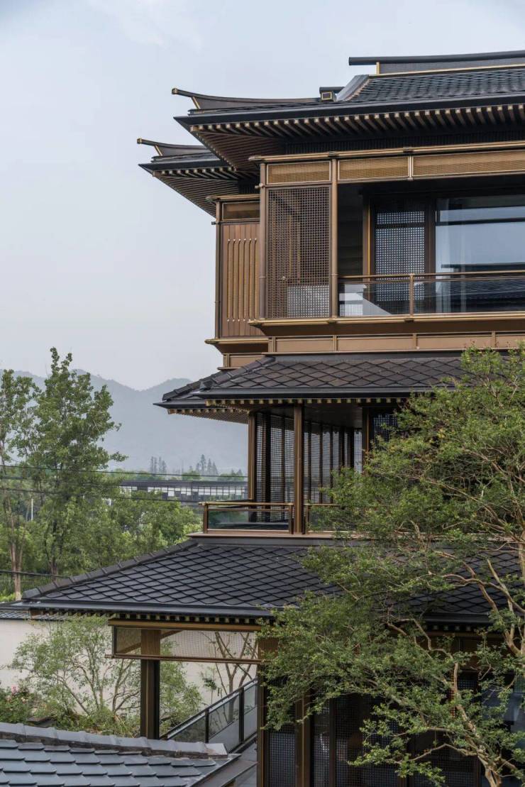 屋顶延续了宋代建筑歇山顶的大基调,同时又依据各单体的落位形态及综合关系做了多样变化,如抱夏式屋顶、L形顶。屋脊采用正脊的形式,取消了传统戗角装饰和鸱吻的符号,脊头呈起翘的姿态,用鎏金边勾勒出细腻的轮廓。搜建筑