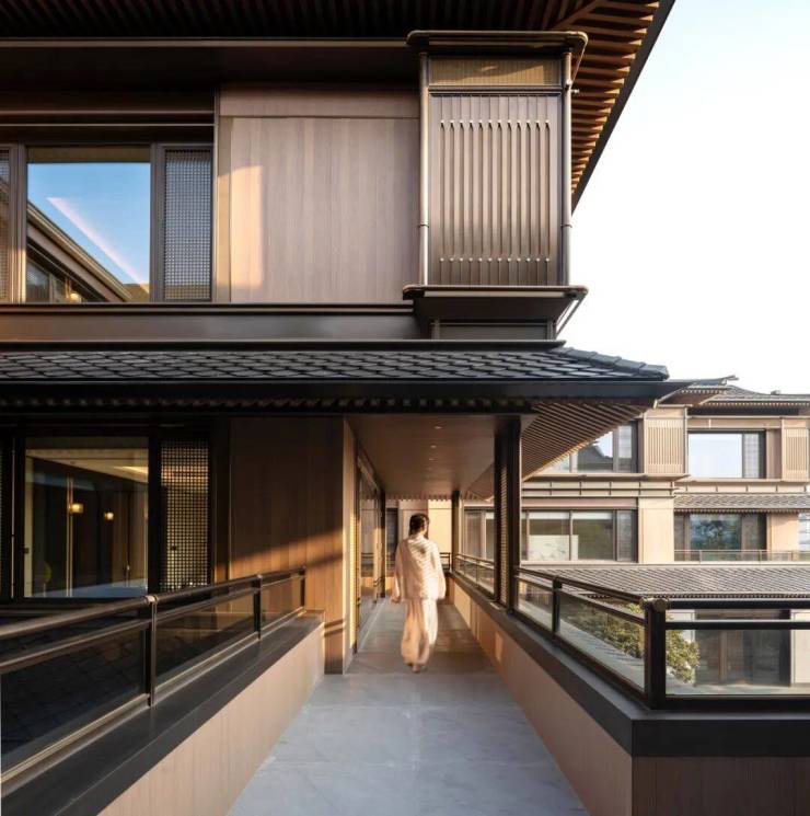 小而精致的四水归堂,形成内敛的氛围,引入自然天光的同时成为室内空间的衬托风景;在主庭院与侧庭院,设计运用通透玻璃立面结合檐下灰空间,形成开阔、无界的交互感受。建筑于此消隐,自然于此显形;二三四层环绕套房的“空中庭院”,日常之中便可缓步沉浸在一副流动的山水画卷中。搜建筑
