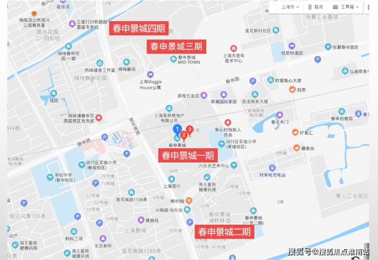 教育方面,3km内涵盖57所幼儿园、14所小学、16所中学,核心优质资源包括闵行区春申景城幼儿园(高兴分园,距324m)、闵行区实验小学(春城校区)、莘松中学(春申校区)等,覆盖全龄教育需求