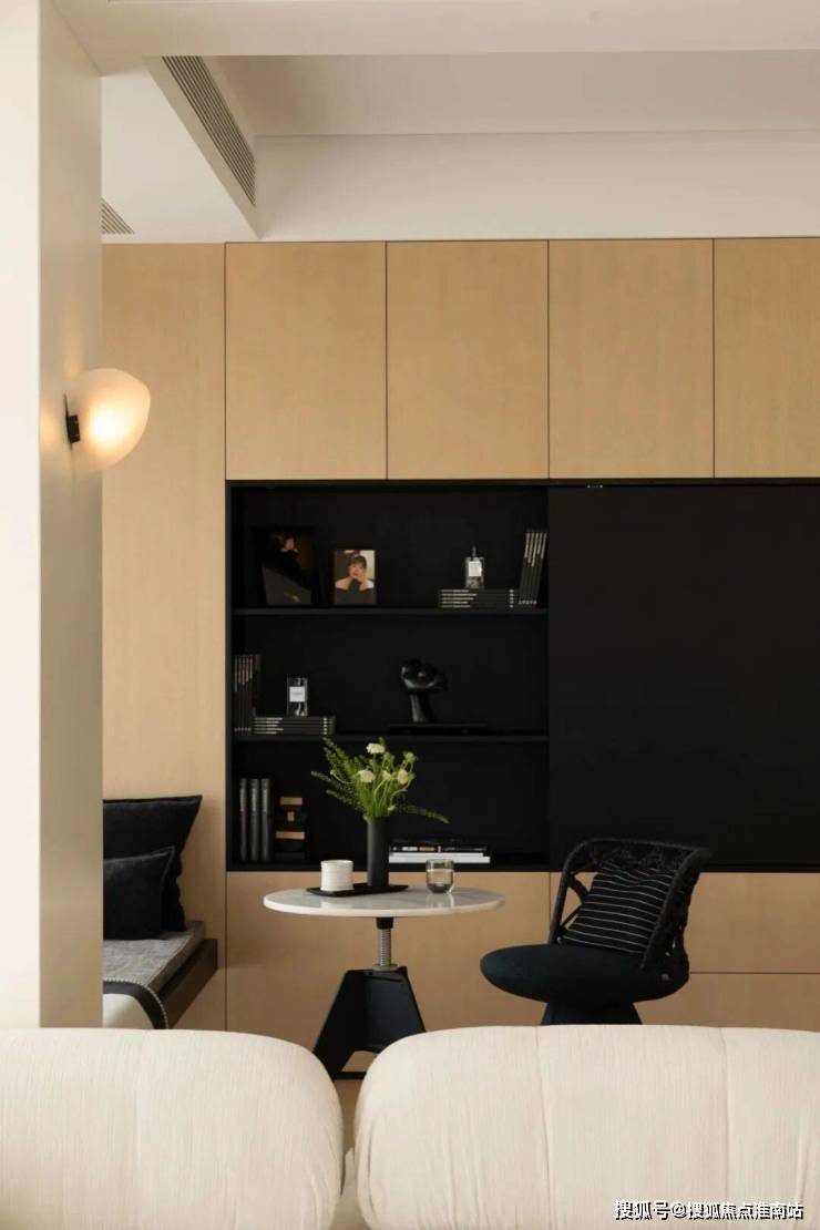 中央的B&B Camaleonda模块组合沙发,以岛状布局重构空间逻辑,双向陈设的低椅背设计。一面朝向书柜电视墙,一面衔接餐厨区。让场景切换随心意而生,既保持空间通透感,又以功能分区提升使用效率。
