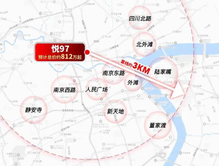 你看地图,如果把视角放大到3公里半径,范围内江涵盖陆家嘴、人民广场、静安寺、南京西路、南京东路、外滩、新天地等城市CBD,上海几乎所有的高能级城市资源都在悦97业主的生活场域之内!