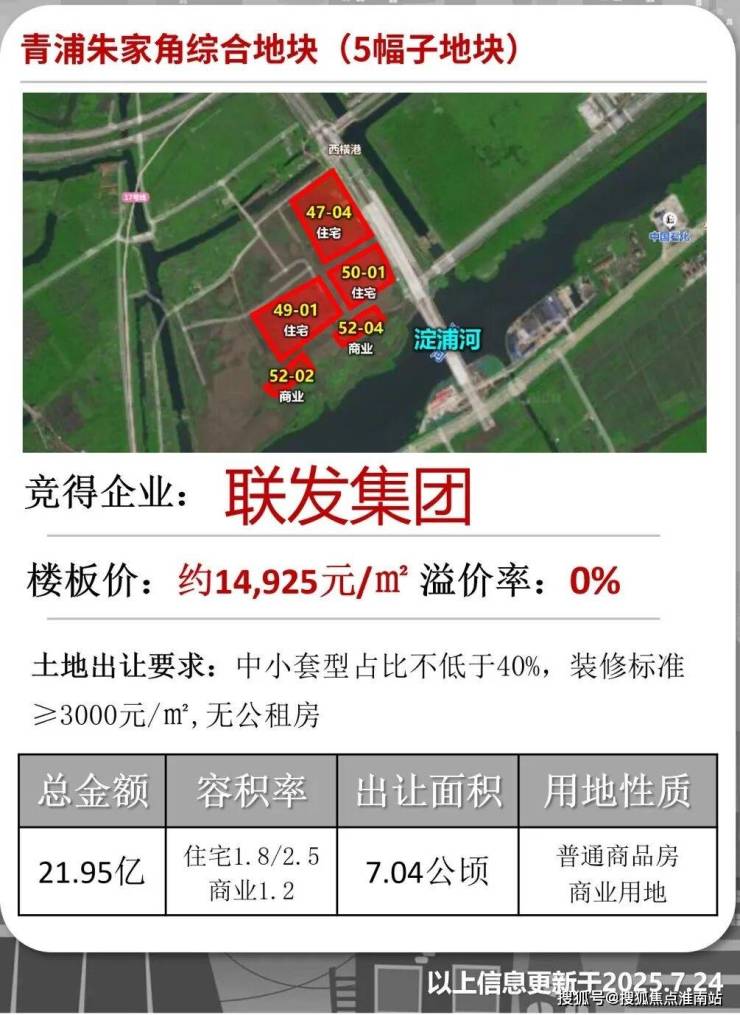 今年7月24日,联发以底价21.95万元竞得青浦区QPC10004、QPC10005 单元47-04、49-01、50-01、52-02、52-04 地块,楼面价14925元/㎡。