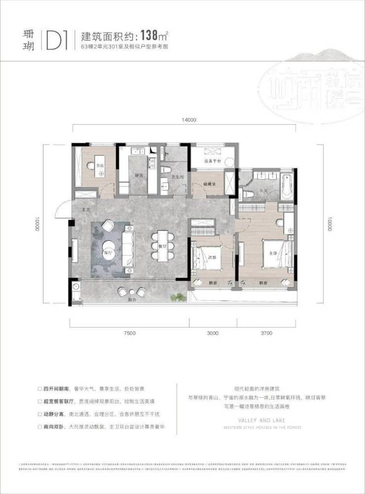 户型为2房2厅2卫,双阳台设计,完美匹配湖山美景。客餐厨动线合理,观景飘窗连通了室内室外两重空间。南北通透、分区合理,尤其是储藏室的设计,十分贴心。99㎡的大两居,恰到好处地放大了各个功能区,整体看过去十分舒畅。