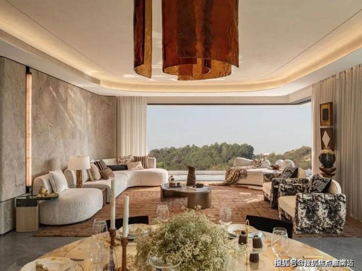 270°的落地窗赋予卧室流动式的景观,由静态的天然意境再次回归自然与家居同频共振的整体感.不只是视觉,清风、暖阳、山野湖景的轮廓借光现行,融进室内的空气中,乃至居住者的日常里.