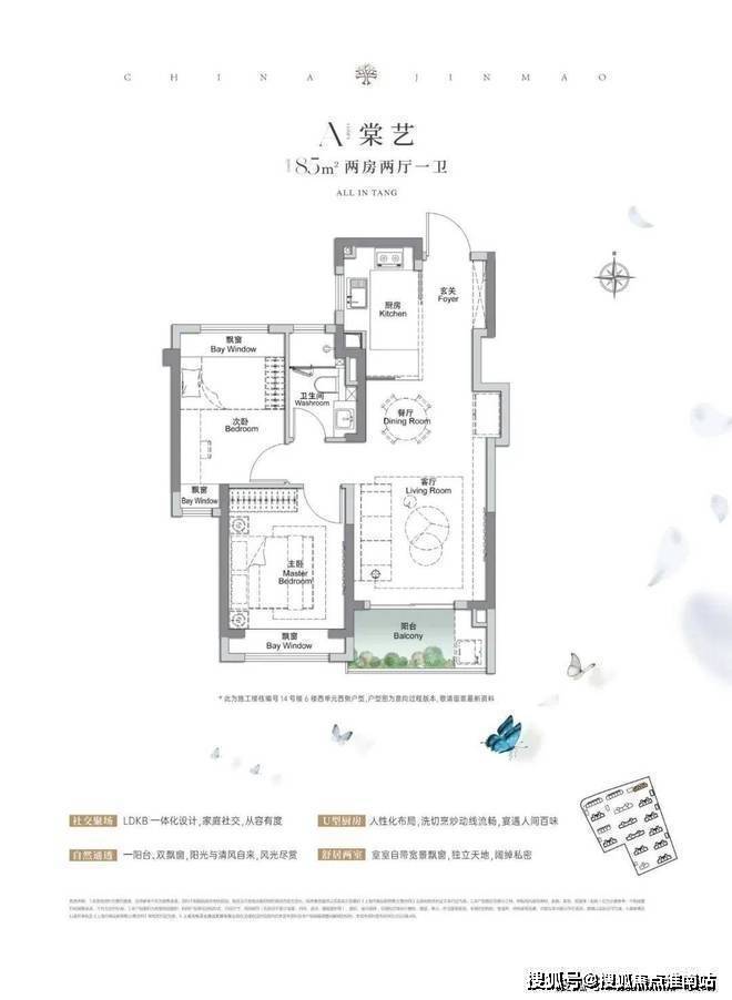 建面约85㎡2房2厅1卫,做到了双开间朝南+3个飘窗+LDKB一体化设计,附加空间非常多.